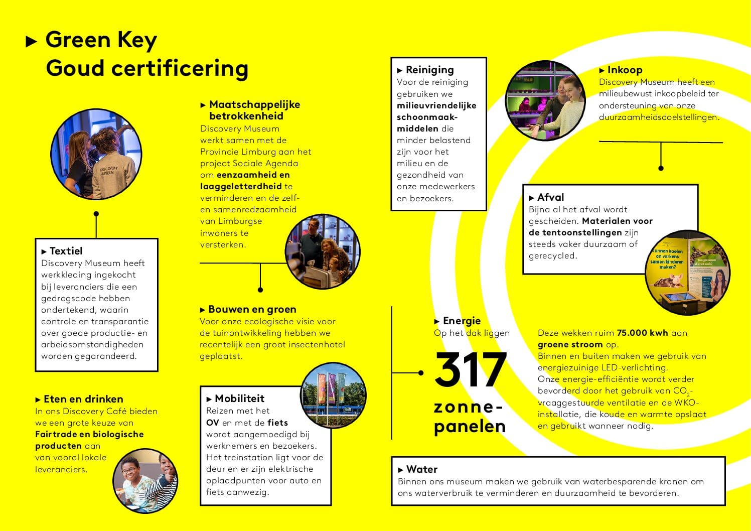 Discovery Museum heeft in 2023 het Green Key goud certificaat behaald. Dit is een internationaal keurmerk voor duurzame bedrijven in de recreatie- en vrijetijdsbranche en zakelijke markt. Bedrijven met een Green Key keurmerk doen er alles aan om het milieu te sparen en voldoen aan strenge normen op het gebied van duurzaamheid, milieu en MVO. Deze normen richten zich op communicatie, gebruik van energie, gas en water, afvalmanagement, mobiliteit, eten & drinken, groen & bouwen, duurzaam inkopen, maatschappelijke betrokkenheid, diversiteit & inclusie en het welzijn van de medewerkers. Het Green Team van Discovery Museum bestaat uit een aantal betrokken medewerkers uit de gehele organisatie en is verantwoordelijk voor het implementeren van MVO-initiatieven en de interne en externe communicatie hieromtrent. Daarnaast heeft zij een actielijst opgesteld voor de korte en lange termijn met maatregelen en doelstellingen op het gebied van duurzaamheid en MVO.