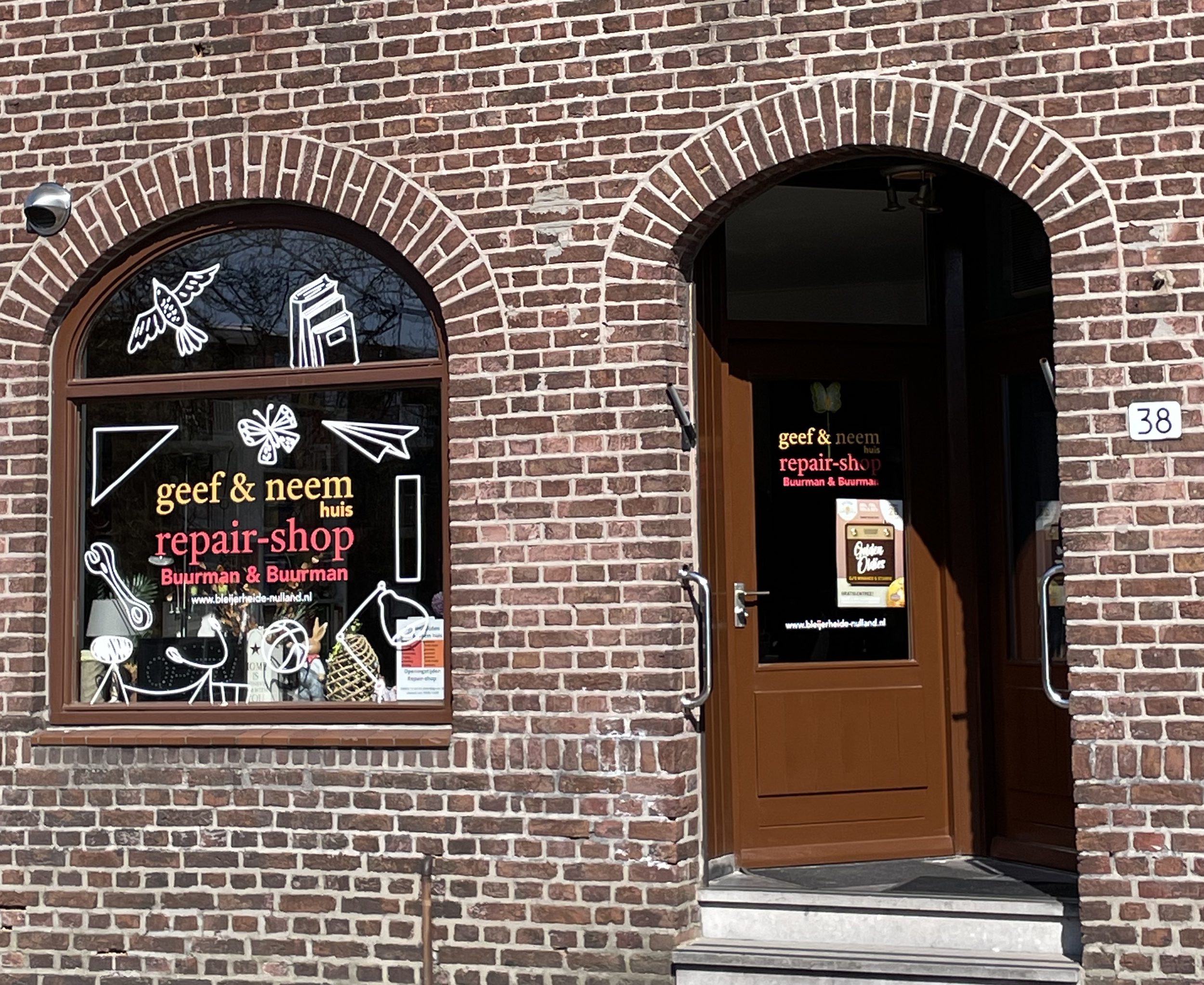 De ondertitel ‘Buurman & Buurman’ is geboren uit het feit dat Jo en Henk ook daadwerkelijk overbuurmannen zijn. Twee heren met hart voor hun medemens en de wil om de buurt op te fleuren. Letterlijk. Eerder onder de vlag van de buurtvereniging en nu ook met de Repair-shop. De ruimte achter de woonkamers van Geef & Neem huis is ingericht met twee grote tafels en een werkbank met gereedschappen. Elke stofzuiger, wafelijzer, tostiapparaat, fiets, radio of lamp wordt onder handen genomen. Dus in principe alle kleine huishoudelijke apparaten, gereedschappen met of zonder stekker, decoratie spullen en natuurlijk ook speelgoed. Witgoed, tv’s en computers kunnen helaas niet aangenomen worden. Meestal met het principe klaar terwijl je wacht, anders op afspraak af te halen op een later moment. Huis- en reparatieregels dienen in acht te worden genomen.